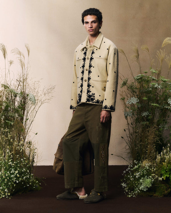 This Elixir shirt imports nature's rhythms in beige handwoven cotton. Handcrafted artistry spirals across the fabric, where embroidered frogs and birds find sanctuary. A sustainable fashion statement reveals earthy charm. Gazing at the Elixir shirt, one can't help but reflect on life's cyclical journey. The spiral patterns echo ripples in still water, tree rings marking the passage of time, or the winding path of personal growth. This garment is more than clothing; it's a canvas of contemplation.